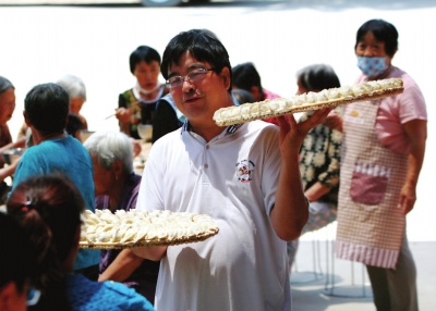 “孝道大餐”現場,史世江和黨員義工一起為老人們端餃子